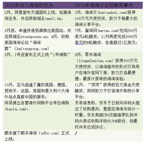 面对这样的大蛋糕,2014年各类巨头加速布局海淘领域,各路资本也快速涌入,海淘市场瞬间风起云涌。不管是电商大佬,还是创业者,都正在努力挖掘海淘产业的巨大市场。